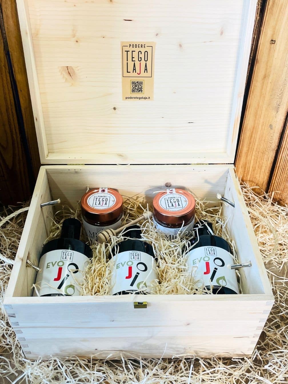 Il tutto racchiuso in una cassa di legno Tegolaja, pensata per essere regalata così com’è, senza bisogno di ulteriori confezioni.